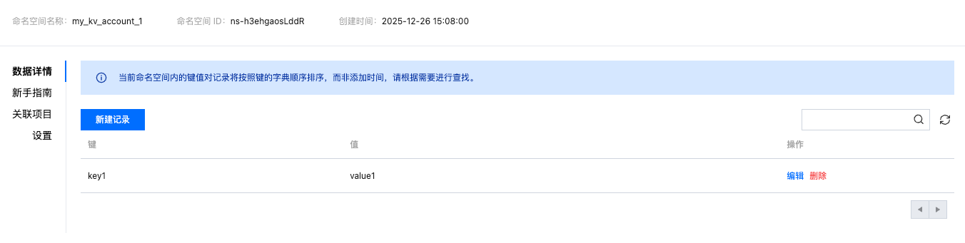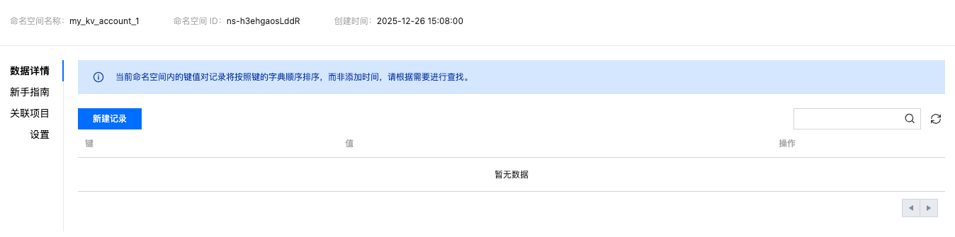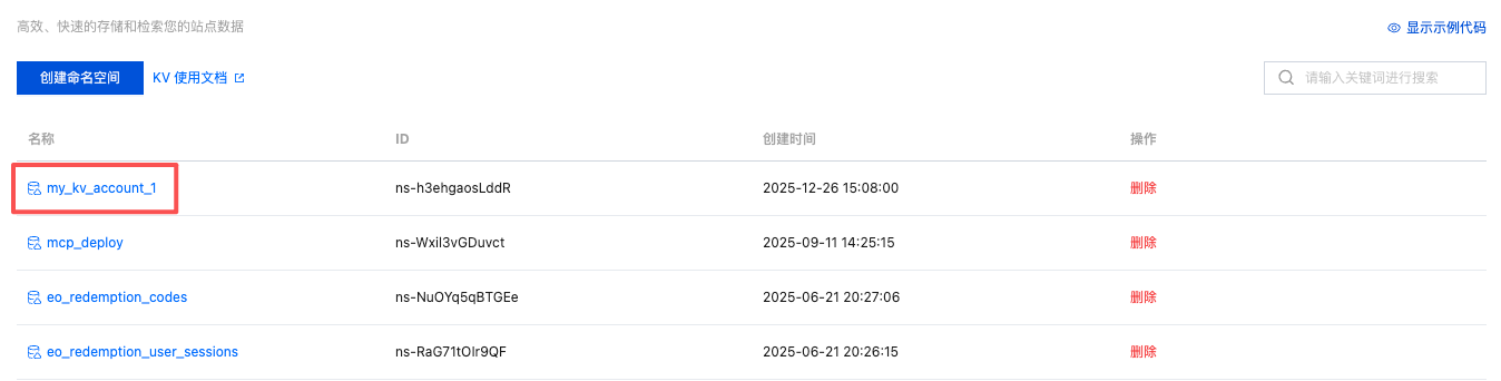 1. 进入命名空间列表:开通 KV 账户后,在“KV存储”页面,点击“创建命名空间”按钮。