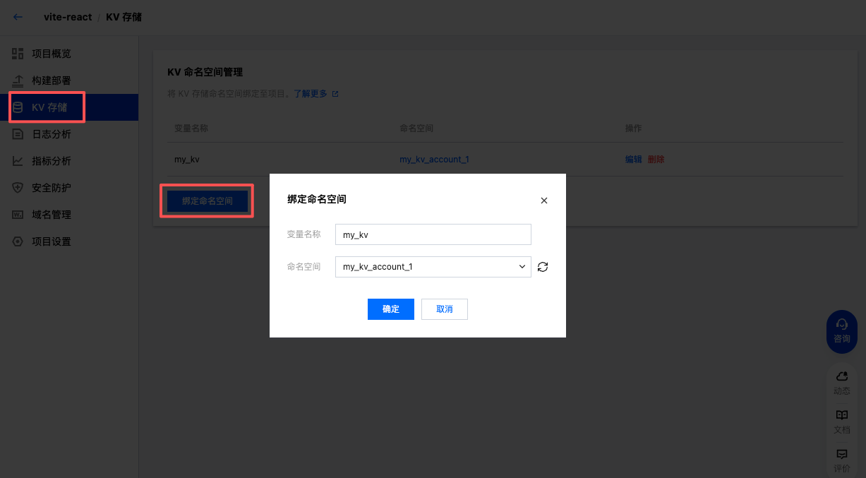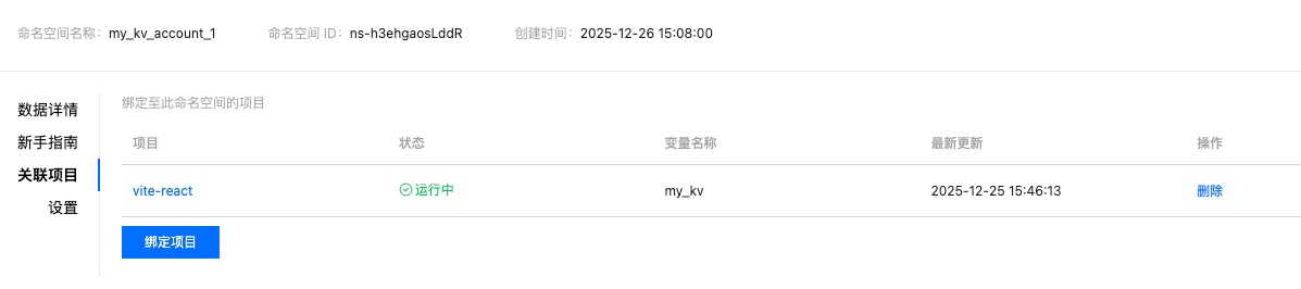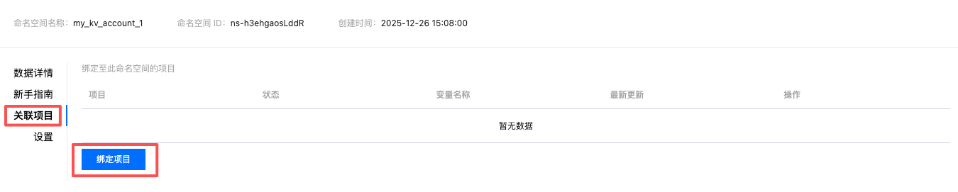 命名空间与项目间的绑定,在“项目”和“KV存储”中,都可以进行绑定。
