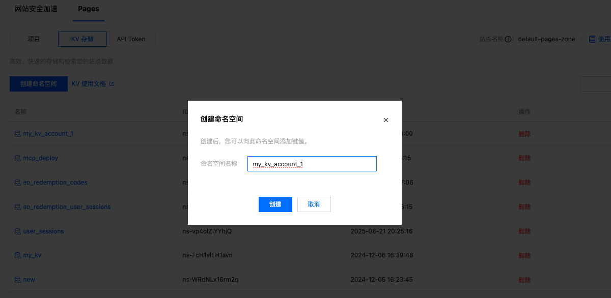 命名空间(namespace)是 Edgeone Pages KV 中数据隔离的基本单位。每个命名空间可以看作是一个独立的 database,各个命名空间之间的数据互不干扰。一个账户可以创建 10 个命名空间。