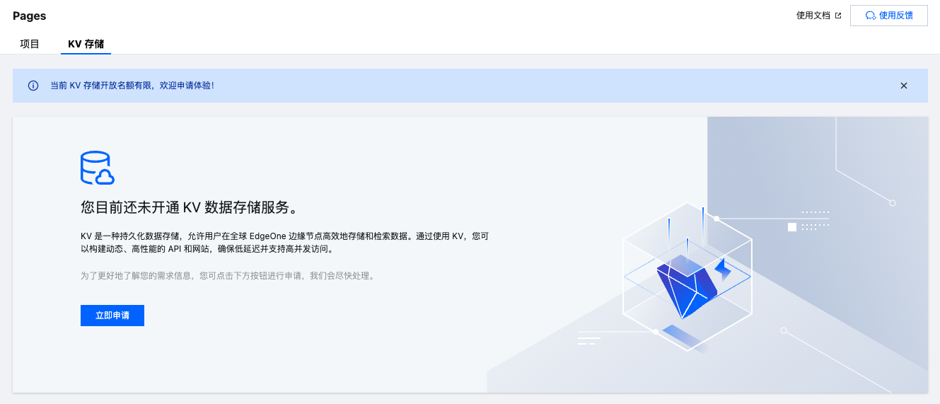Edgeone Pages KV 账户是 Pages 业务中 KV 用量统计和计费的最小单位。一个 EdgeOne Pages 账户对应 一个 KV 账户,用户在控制台页面开通后创建。账户存储容量 1GB。
