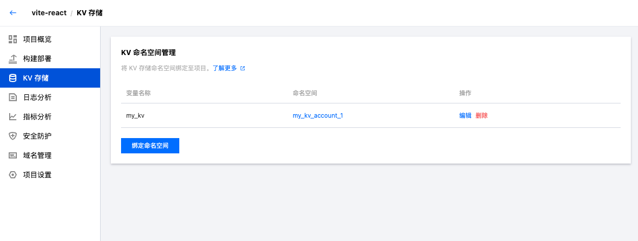 变量名是绑定项目跟命名空间时定义的运行时环境变量名称。 在使用命名空间数据之前,需要先将命名空间跟 Edgeone Pages 项目进行绑定。命名空间跟项目的绑定关系为多对多,在绑定时通过不同的运行时环境变量名称来区分使用。