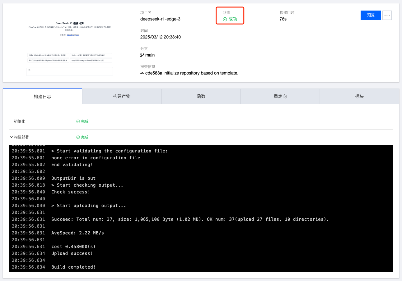 EdgeOne Pages 将自动构建您的项目并将其部署到全球边缘网络。