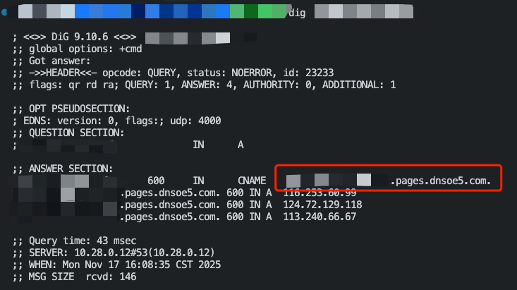 如果您已正确配置 CNAME,当前状态仍显示未生效,也可能是域名解析服务商的 CNAME 解析生效延迟,您也可以通过以下方式手动验证。