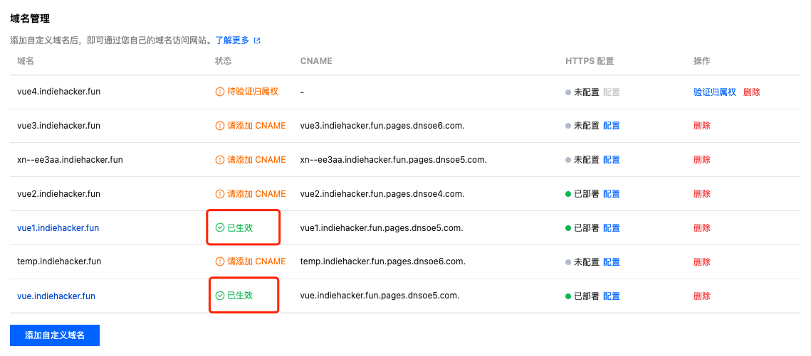 完成 CNAME 配置后,平台将自动检测当前 CNAME 状态是否已生效,如果在域名管理列表的状态一栏显示当前 CNAME 已生效,则当前域名已正确配置并开启加速。