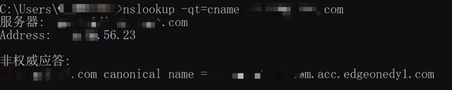 在 Windows 系统中,打开 cmd 运行程序,以域名 www.example.com为例,您可以在 cmd 运行:nslookup -qt=cname www.example.com,根据运行的解析结果内,可以查看该域名的 CNAME 信息。若 CNAME 结果为 EdgeOne 内分配的 CNAME 地址,即已切换至 EdgeOne 加速。