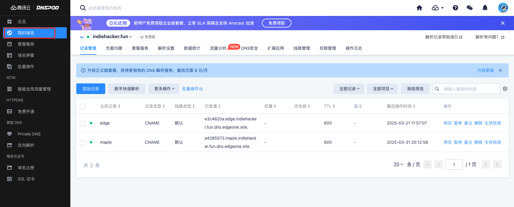 在“我的域名”列表中,找到目标域名,点击“域名”进入其【记录管理】页面。