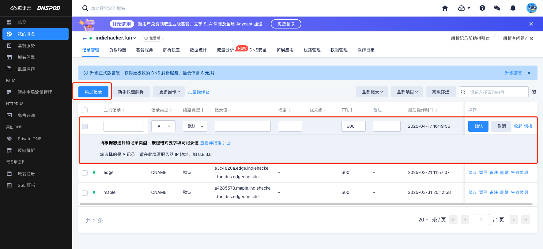 此步骤需确保域名已托管在 DNSPod,若未托管,可通过控制台添加。