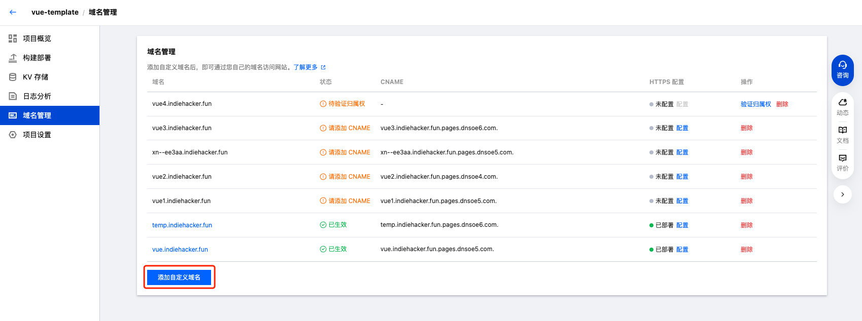 2. 添加域名:点击“添加自定义域名”按钮。