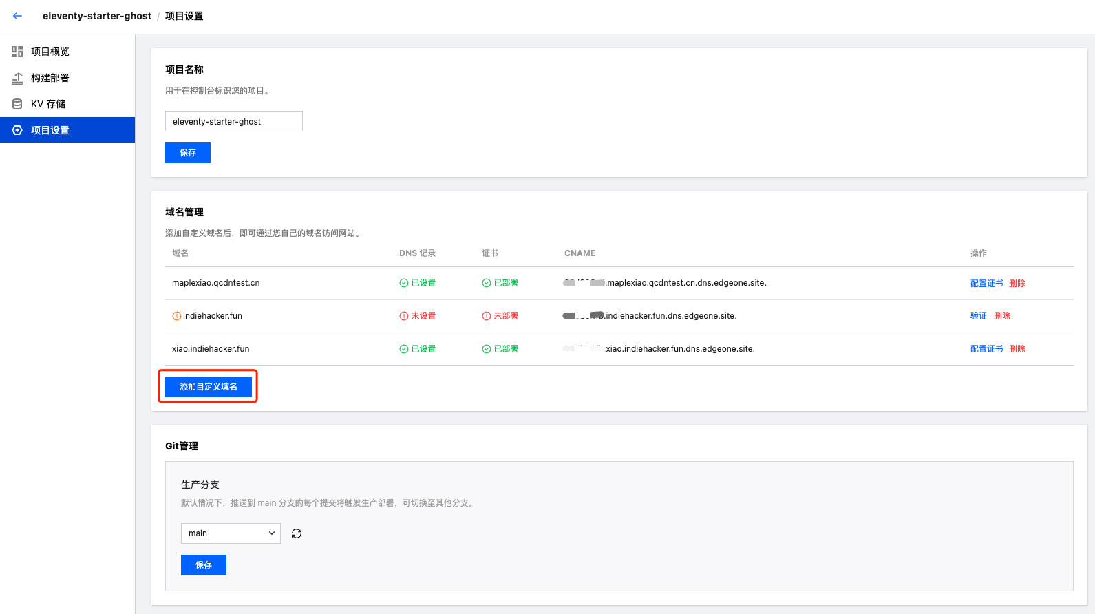 要为您的项目添加自定义域名,请按照以下步骤操作: