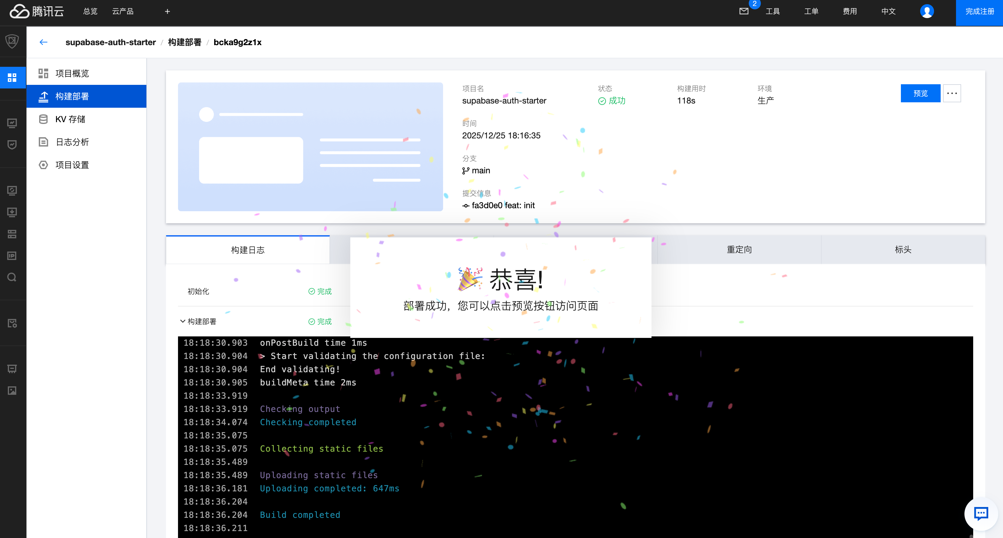 填写好参数后,点击 “开始部署”,部署会花费1-3分钟。如果项目出现部署失败,可以根据“构建日志”和“构建产物”信息修改项目,或者联系工作人员解决。