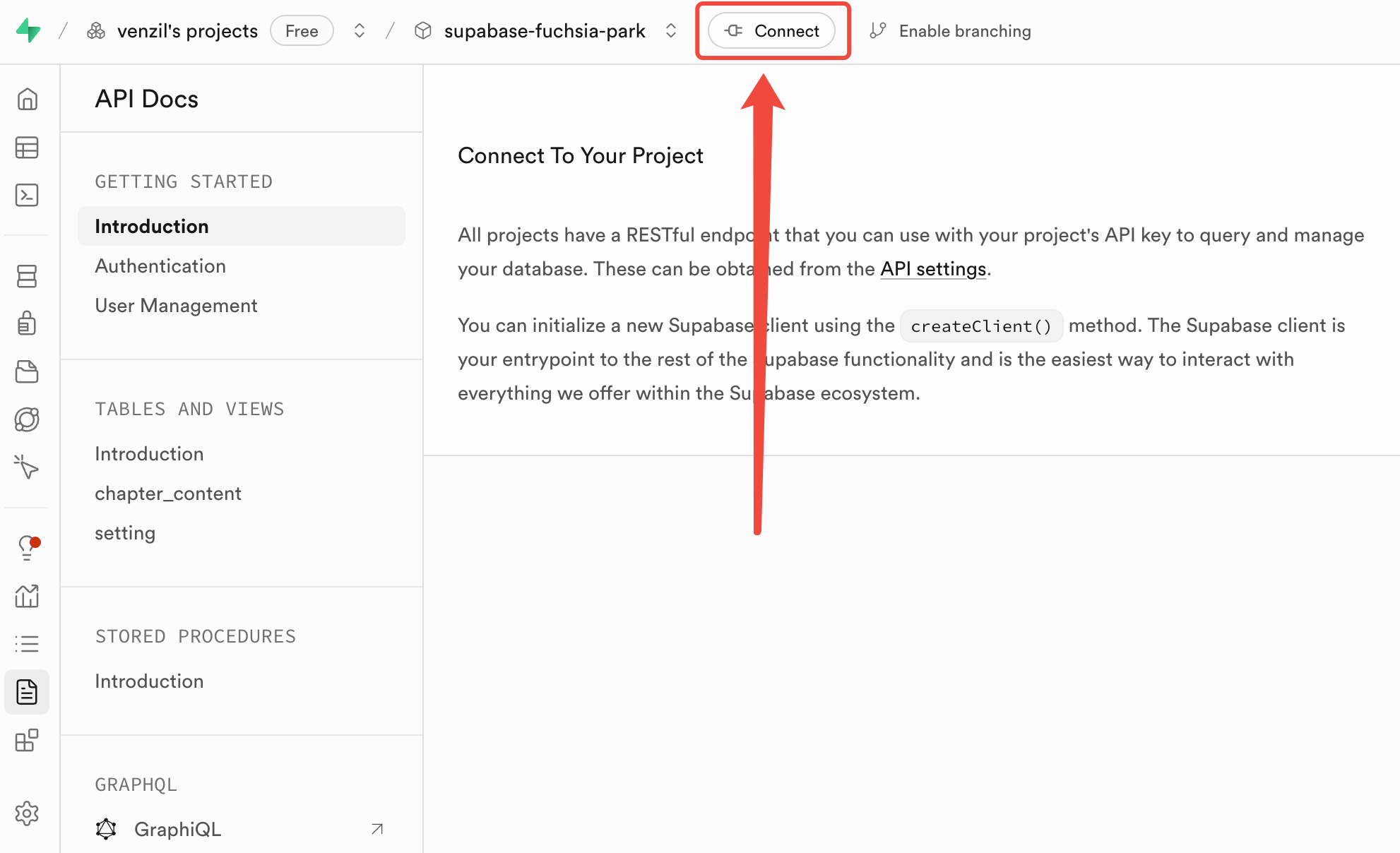 API Docs,进入后会默认进入到 Introduction 中,点击上方的 Connect 选择连接方式。