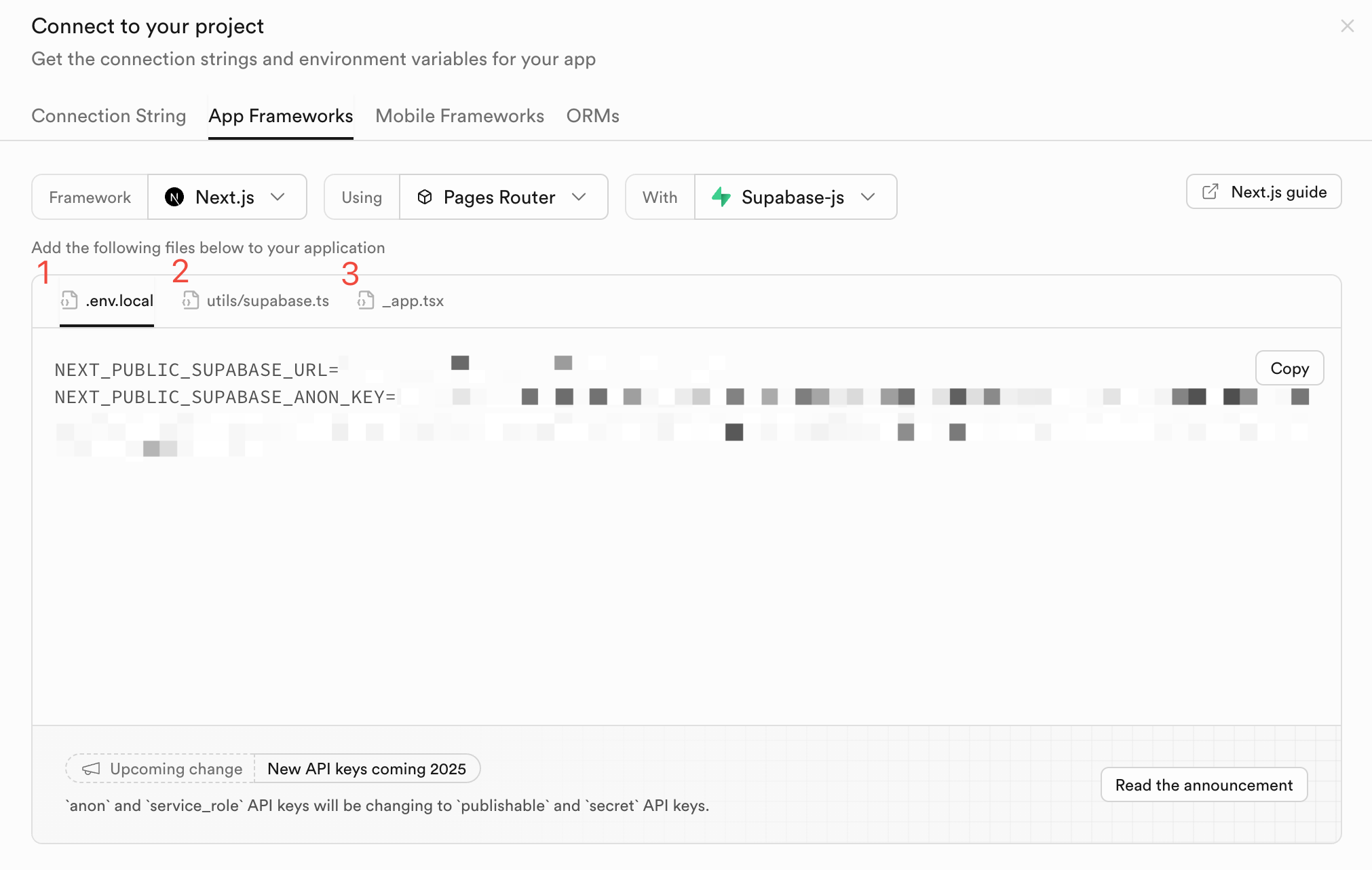 .env.local 然后写入 URL 和 KEY,这里示例为 NEXT_PUBLIC 开头的变量,这在部分框架中会产生警告和报错。NEXT_PUBLIC_SUPABASE_URL=https://url.supabase.coNEXT_PUBLIC_SUPABASE_ANON_KEY=key