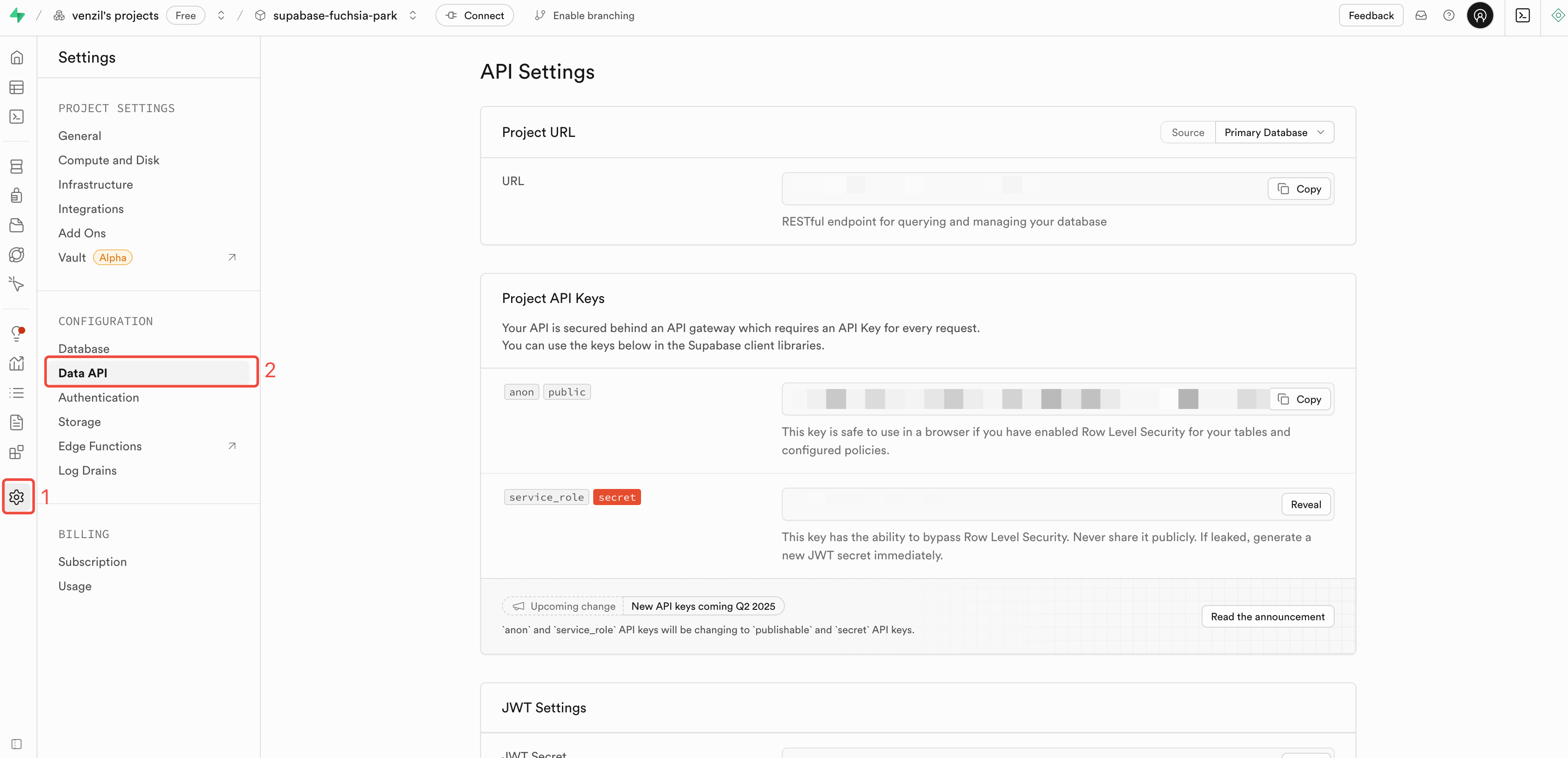service_role,或者 JWT Settings,可以在左侧导航栏中选择 Project Settings -> Data API,然后找到相关参数。