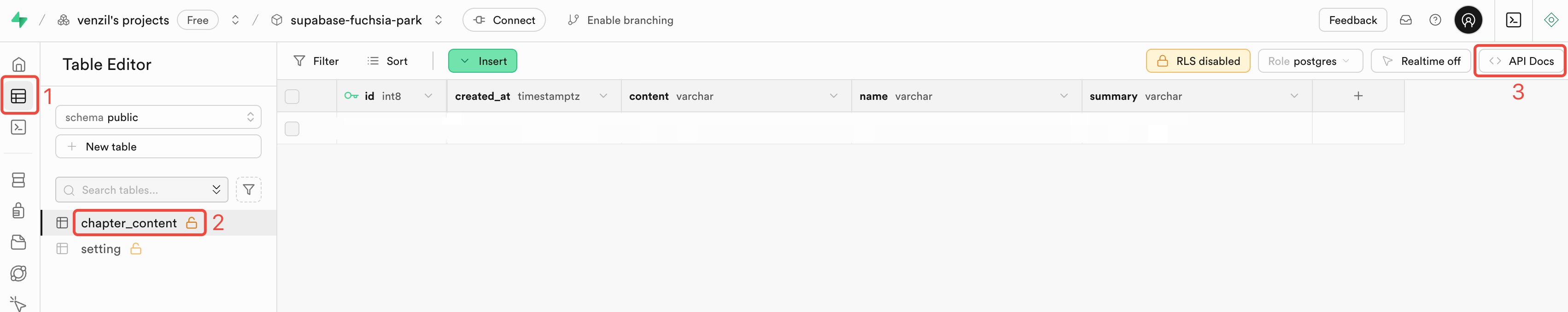 Table Editor,选择相应表格后,可以在左侧面板查看API Docs,文档提供了丰富的操作示例和详细说明。注意设定 RLS disabled,这可能导致数据获取失败。