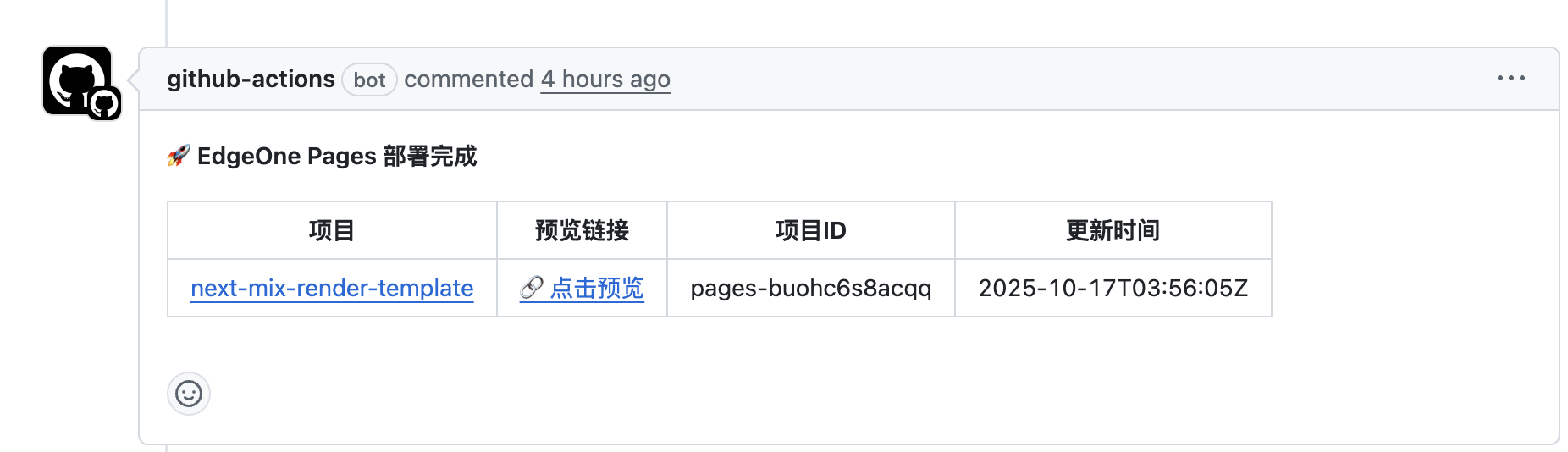 .github/workflows/deploy.yml 配置如下:name: Build and Deployon:pull_request_target:types: [opened]jobs:Deploy-Preview:runs-on: ubuntu-latestpermissions:pull-requests: writesteps:- uses: actions/checkout@v4- name: Setup Node.jsuses: actions/setup-node@v4with:node-version: '22.11.0' # 选择适合的 Node.js 版本- name: Install dependenciesrun: npm install- name: Build projectrun: npm run build- name: Deploy to EdgeOne Pagesid: deployrun: |echo "Deploying to EdgeOne Pages..."DEPLOY_OUTPUT=$(npx edgeone pages deploy ./.next -n next-mix-render-template -t ${{ secrets.EDGEONE_TOKEN }} -e preview 2>&1)DEPLOY_URL=$(echo "$DEPLOY_OUTPUT" | grep "EDGEONE_DEPLOY_URL=" | cut -d'=' -f2-)echo "DEPLOY_URL=$DEPLOY_URL" >> $GITHUB_OUTPUTPROJECT_ID=$(echo "$DEPLOY_OUTPUT" | grep "EDGEONE_PROJECT_ID=" | cut -d'=' -f2-)echo "PROJECT_ID=$PROJECT_ID" >> $GITHUB_OUTPUTDEPLOY_END_TIME=$(date -u +"%Y-%m-%dT%H:%M:%SZ")echo "DEPLOY_END_TIME=$DEPLOY_END_TIME" >> $GITHUB_OUTPUTenv:EDGEONE_API_TOKEN: ${{ secrets.EDGEONE_TOKEN }}- name: Enable PR comments # 支持在代码合并前部署预览链接uses: thollander/actions-comment-pull-request@v2with:message: |🚀 **EdgeOne Pages 部署完成**| 项目 | 预览链接 | 项目ID | 更新时间 ||---|---|---|---|| [${{ github.event.repository.name }}](https://console.tencentcloud.com/edgeone/pages/project/${{ steps.deploy.outputs.PROJECT_ID }}/deploy) | [🔗 点击预览](${{ steps.deploy.outputs.DEPLOY_URL }}) | ${{ steps.deploy.outputs.PROJECT_ID }} | ${{ steps.deploy.outputs.DEPLOY_END_TIME }} |