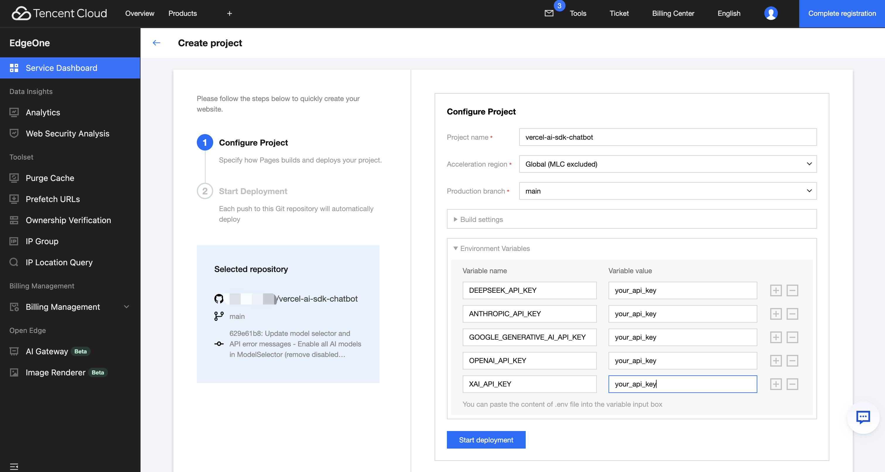 点击模版详情页的 "Deploy" 按钮进入 EdgeOne Pages 控制台。进入控制台后,在项目部署页面会出现环境变量配置列表,这里的环境变量配置其实是配置将要使用的 AI 对话模型对应的 API Key,部署上文中的不同模板会显示不同的配置列表。但是至少要配置一个可正常使用的 API Key。