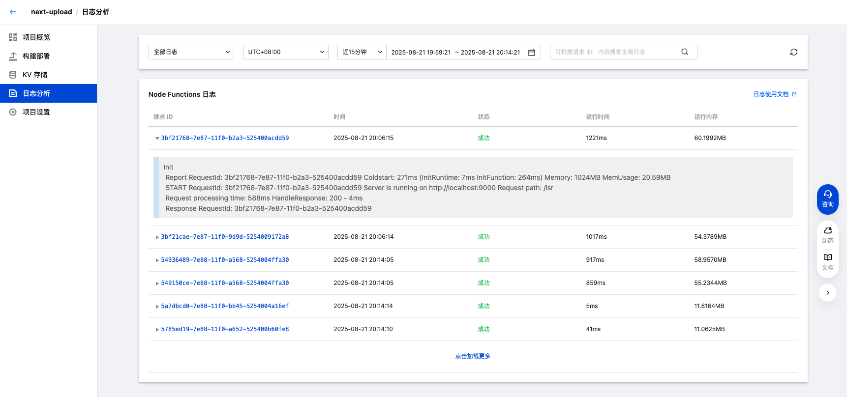 Pages 日志分析为您自动收集、存储、过滤和分析 Node Functions 发出的日志数据。您可以在控制台中查询每个函数请求的数据,自定义查找日志的时间范围,目前支持查看全部日志、调用成功、调用失败、调用超时的日志。