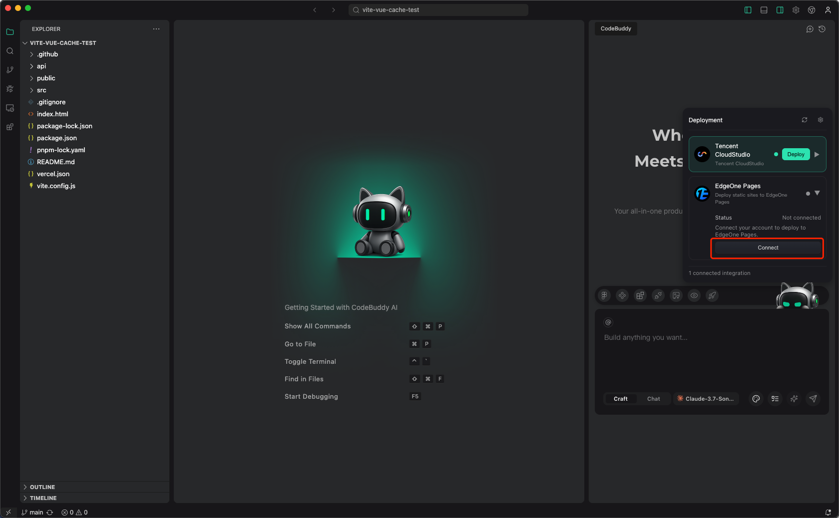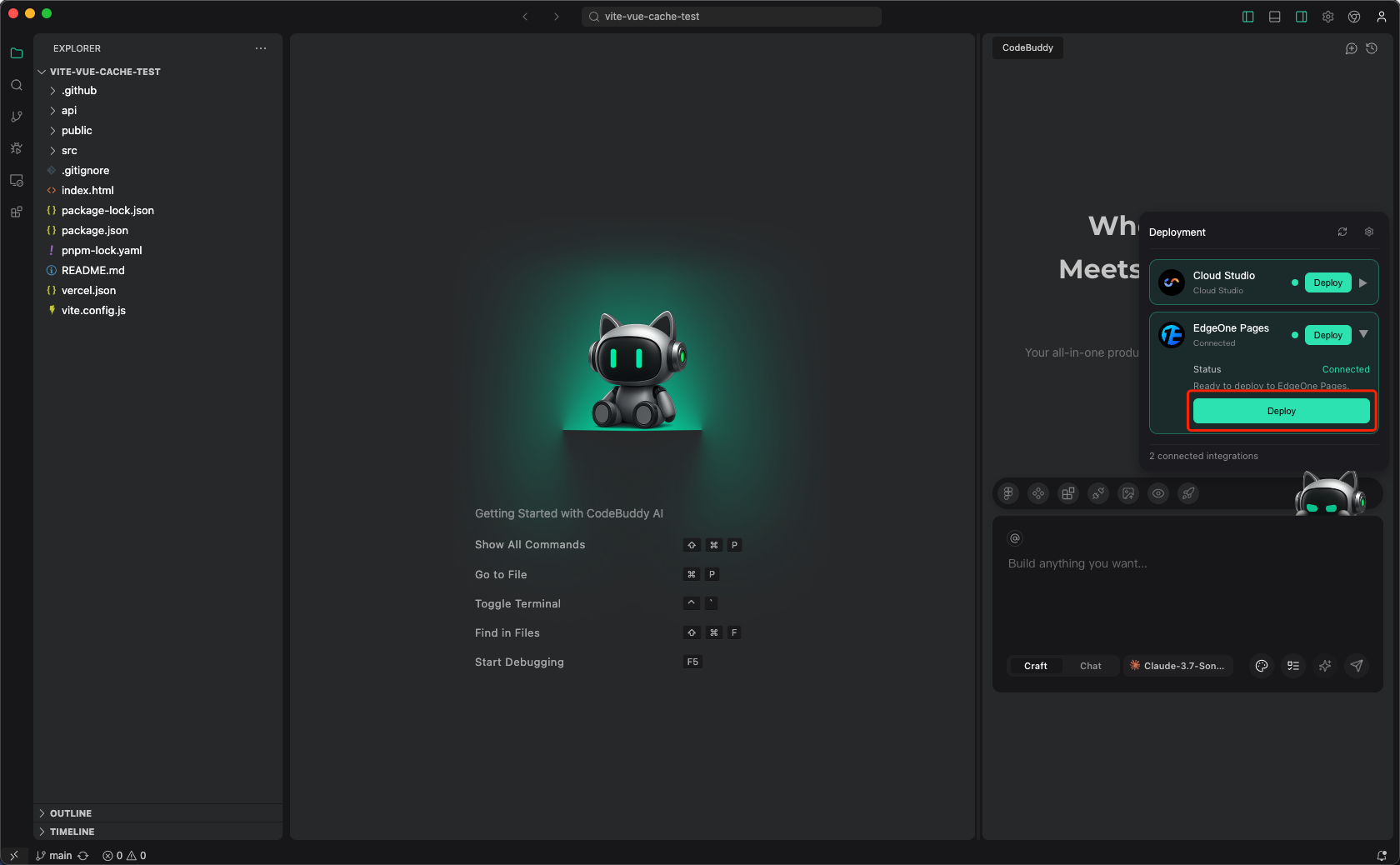 在 CodeBuddy IDE 里面点击 Deploy 按钮,选择 EdgeOne Pages 进行连接。