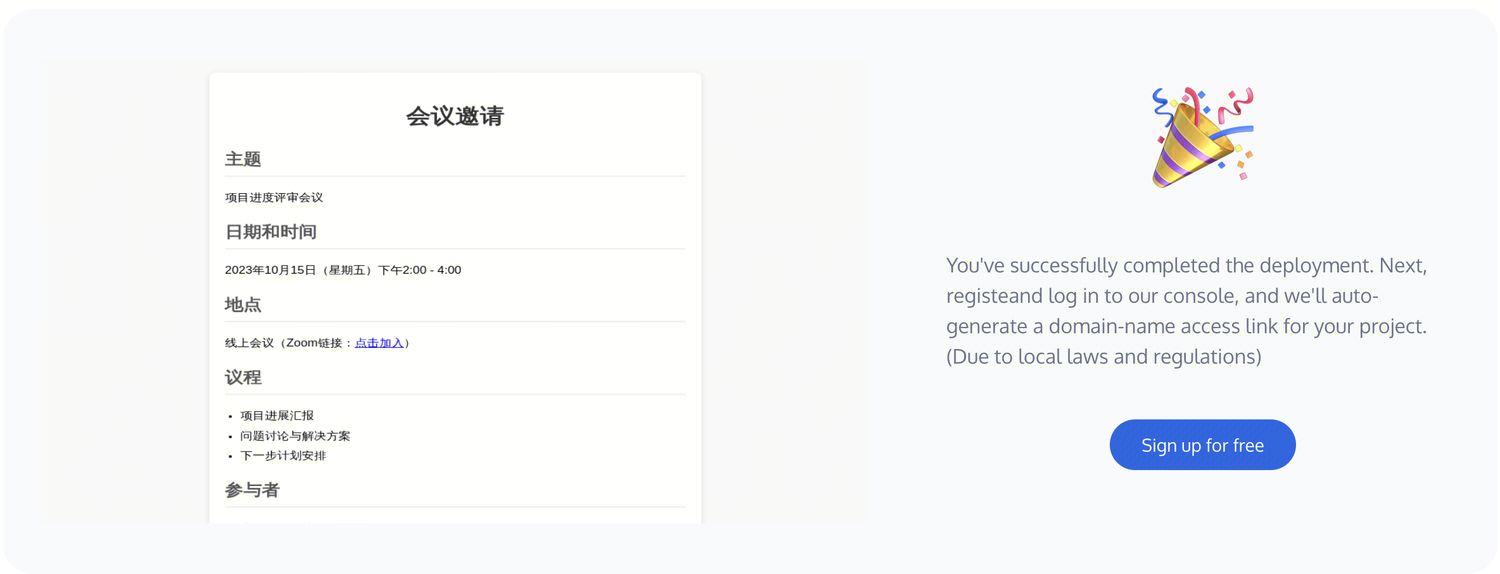 即时 URL 生成:上传 ZIP 文件或 HTML 文件,数秒内获得可公开访问的 URL。