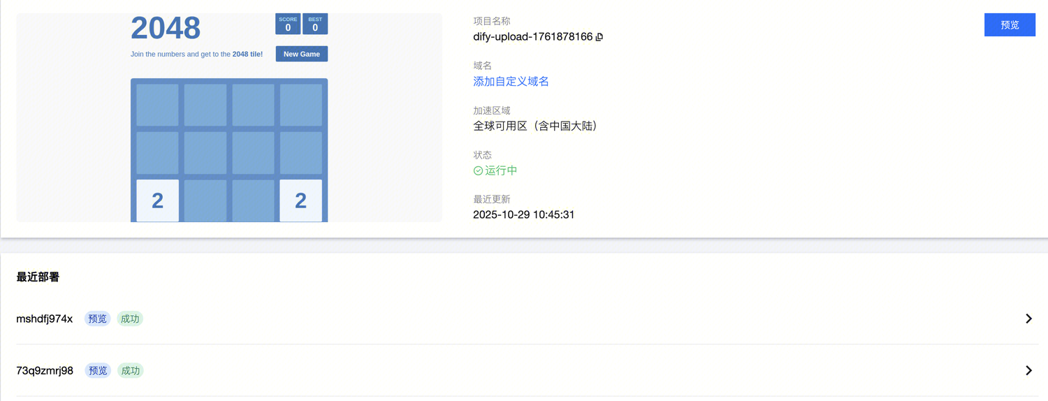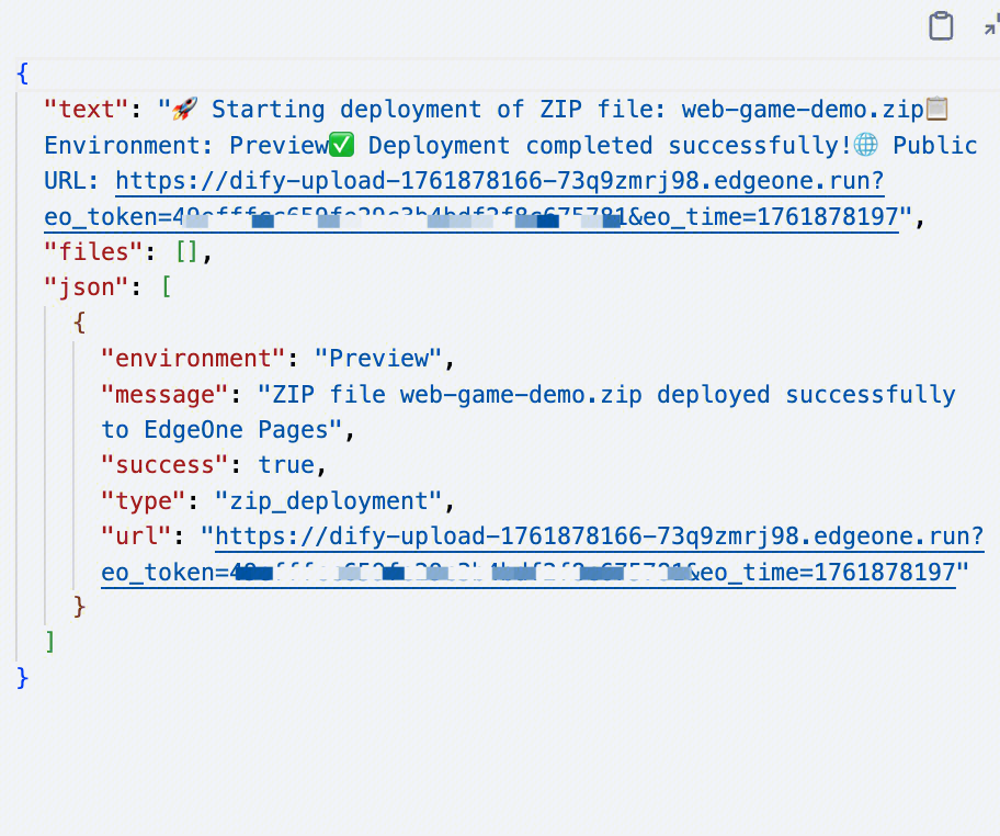 项目版本管理:构建你的项目并压缩构建内容为 ZIP,在 Dify 应用中选择 EdgeOne Pages 部署 ZIP 文件功能,上传文件就能获取下方部署成功链接。我们在部署前可以选择生产环境或测试环境,部署后可以在应用中查看链接,或者进入 EdgeOne Pages 控制台修改域名。