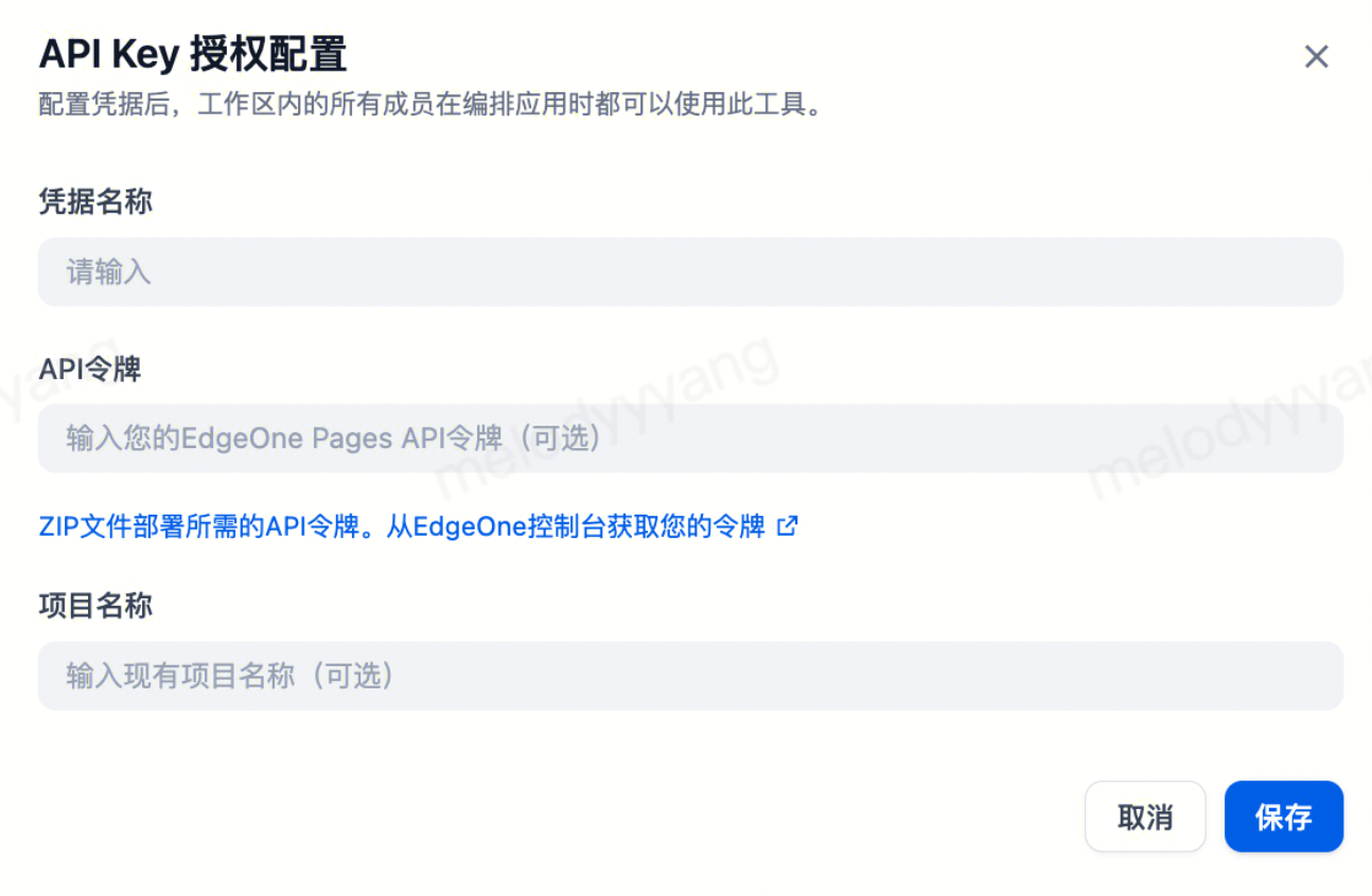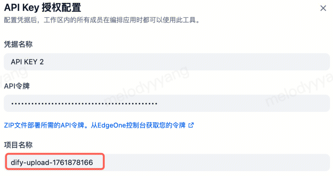 如果你需要更新现有的项目,可以在 API Key 授权配置中填上待更新的项目名称。